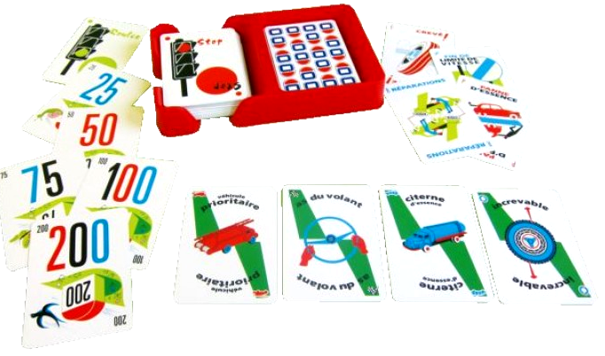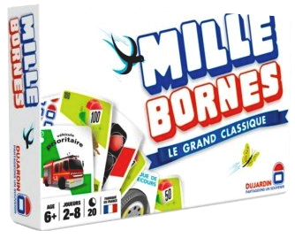 Vous êtes un conducteur émérite et vous devez parcourir 1000 kilomètres en respectant les limitations de vitesse, les feux de signalisation et en subissant des pannes. Le 1000 Bornes est un jeu de cartes, 106 exactement, réparties en quatre catégories : les étapes, les attaques, les parades et les bottes. Les étapes. Ces cartes sont la clef de la victoire. Exposées devant vous, elles représentent les Kms que vous avez parcourus en additionnant leur valeur (25, 50, 75, 100 et 200). Les attaques et parades. Se posant sur une pile adverse pour la retarder, elles ont toujours leur parade. L’équipe attaquée ne peut plus rouler tant qu’elle n’a pas posé une parade pour annuler les effets de l’attaque. Les bottes. Elles sont au nombre de quatre et, une fois posées, interdisent les attaques correspondantes. Par exemple la botte “increvable” interdit les attaques “crevaison”. Ces cartes permettent aussi les coups fourrés, actions procurant un certain nombre d’avantages comme un supplément de 300 points. Le jeu se pratique individuellement ou en équipe (une pile par équipe). Chaque joueur, durant son tour, pioche une nouvelle carte afin de porter le total de sa main à sept. Puis il doit jouer une carte (et une seule) qui lui permettra d’avancer son kilométrage si les conditions de sa pile l’y autorisent, d’arrêter les effets d’une attaque (poser un feu vert sur un feu rouge par exemple), de stopper avec une carte d’attaque les élans d’un adversaire, etc. S’il ne peut jouer aucune carte, il se voit contraint de défausser. Afin de bien visualiser les “conditions de voyage” de chacun, une disposition claire des cartes devant soi est à adopter. À la fin d’une manche, c’est-à-dire lorsque 1000 bornes sont exposées ou que le sabot est épuisé, on calcule les points de chaque participant en fonction des éléments posés et autres bonus. Une partie se joue en plusieurs manches pour atteindre un total de 5000 points, et de petites variantes, comme marquer une prime de 500 points si l’on gagne une manche sans aucune étape de 200 ni de 100, sont possibles.