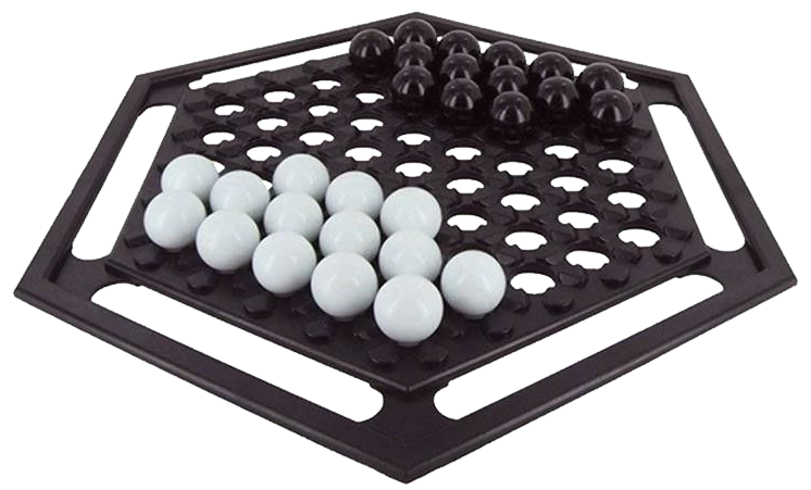 Tel un sumotori, poussez les boules de votre adversaire hors de la surface de jeu. Hexagonal. “Abalone” est un jeu abstrait qui se pratique sur un tablier de forme hexagonale de 5 cases, ou trous, ou creux, ou points, de côté. Chaque joueur place ses 14 boules, blanches pour l’un, noires pour l’autre, sur 3 lignes (5 - 6 - 3 / voir figure). En avant ! À son tour, un joueur peu déplacer d’une case et dans un même mouvement, 1, 2 ou 3 de ses pièces alignées, dans toutes les directions. Les groupes sont déplacés soit : 1/ en ligne : d’avant en arrière. 2/ en flèche : latéralement, sans modifier l’alignement des boules qui ne se déplacent que d’un seul point. Dans un alignement de plus de 3 boules, le joueur actif choisit la partie qu’il veut déplacer. Poussez pas ! Lors des déplacements, il est possible de pousser les boules de son adversaire. Pour cela, il faut être en position de “sumito”, c’est-à-dire en contact et en supériorité numérique. La poussée n’est possible que dans un axe droit et si une case est libre derrière la, ou les boules attaquées. Un “sumito” peut être de 2 sur 1, de 3 sur 1 et de 3 sur 2. Lorsque les forces sont égales, il y a “pac”, et elles s’annulent. Lorsqu’une poussée fait sortir une boules du plateau, il y a “eject”. Une poussée n’est jamais obligatoire ! Mais comment je gagne ? Le premier à sortir du plateau 6 boules de l’adversaire est déclaré “Grand Vainqueur”. Note : En plus des règles de bases, il existe de multiples variantes comme le jeu à 3.