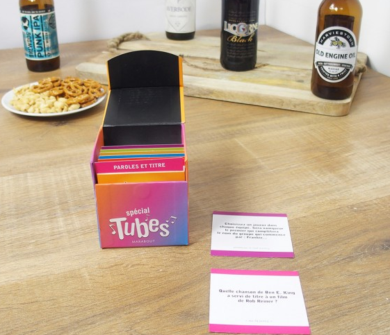 240 questions et défis sur des mégatubes internationaux, des Beatles à nos jours. Répondez, devinez, mimez, chantez à l’apéro, pour remporter la partie en brillant avec votre culture musicale. Les tubes d’hier et d’aujourd’hui animeront votre soirée apéro ! Saurez-vous citer les 5 plus grands tubes de Mickael Jackson ? Connaissez-vous la première phrase du tube En apesanteur de Calogero ? Relevez le défi ! 6 catégories: