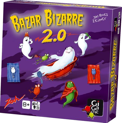 Encore plus de Bazar pour ce jeu de réflexes réservé aux fantômes vifs d’esprit ! Bazar Bizarre 2.0 est un jeu complet qui peut être joué avec ou sans Bazar Bizarre. En effet, il est possible de réunir les deux versions pour encore plus de délire. Les règles pour combiner les deux Bazar Bizarre se trouvent en page 6 (« Quand Bazar Bizarre rencontre Bazar Bizarre 2.0 »). Amusez-vous et gardez votre sang-froid ! Principe et but du jeu Une petite fantômesse coquette débarque dans le vieux château hanté. Tandis que Franklin est occupé dans la cave, elle lui dérobe son vieil appareil photo et se cache dans la salle de bains pour faire des clichés de ses objets favoris et d’une curieuse grenouille. Mais les couleurs des photos sont parfois mauvaises et elle n’arrive plus à s’y retrouver. Aidez la petite fantômesse à identifier rapidement les bons objets : les plus vifs ont les meilleures chances de remporter la partie. MISE EN PLACE Disposez les cinq figurines en cercle au milieu de la table. Mélangez les cartes et formez une pile, face cachée. jeu de base : Attraper la bonne figurine Le dernier joueur à avoir pris un bain retourne la première carte de la pile de manière à ce que tous les joueurs, lui compris, la découvrent en même temps. Si la carte représente l’une des figurines dans sa couleur réelle, chacun essaye alors d’attraper cette figurine, le plus vite possible et d’une seule main.Si rien sur la carte ne correspond exactement à une figurine (ni la forme, ni la couleur), les joueurs doivent vite attraper la seule figurine qui n’a absolument rien en commun avec la carte. En cas d’erreur… Chacun des joueurs n’a droit qu’à un seul essai. Si un joueur attrape une mauvaise figurine, il perd une des cartes qu’il a gagnées, s’il en possède, et la donne au joueur qui a attrapé la bonne. Si plusieurs adversaires se sont trompés, ils donnent chacun une carte au vainqueur de ce tour. Règle du jackpot Si tous les joueurs se sont trompés, personne ne gagne de carte. Les cartes rendues par chaque joueur forment alors, avec celle qui avait été retournée, un jackpot sur la table. La carte suivante est révélée et le joueur qui s’empare de la bonne figurine gagne la carte retournée et toutes les cartes du jackpot. Fin du tour Le joueur qui a attrapé la bonne figurine la remet au centre de la table. Il remporte la carte du tour qu’il pose devant lui. Puis, il retourne la carte suivante de la pile, toujours de manière à ce que tout le monde la découvre en même temps. Fin de la partie La partie prend fin quand la pile de cartes est épuisée. Le joueur qui possède le plus de cartes devant lui est le grand vainqueur ! VARIANTES : ATTRAPER OU NOMMER ? Les variantes suivantes (A, B et C) peuvent être cumulées ou jouées indépendamment les unes des autres pour corser la difficulté du jeu. Si une grenouille apparaît sur la carte, les joueurs ne doivent plus attraper une figurine mais la nommer à la place.