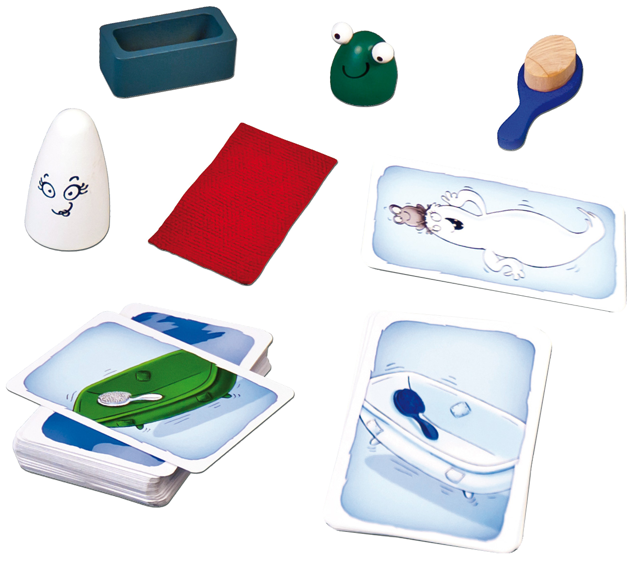Note : les joueurs décident en début de partie s’ils choisissent d’utiliser l’anglais ou une autre langue étrangère. Vous trouverez plus loin la liste des termes en anglais, italien et allemand pour chacun des éléments. c) Qui a volé la serviette de bain ? À chaque fois qu’une serviette apparaît sur une carte, les joueurs doivent attraper la figurine de la même couleur que la serviette. Si elle est accompagnée d’une grenouille, il ne faut pas attraper la figurine mais annoncer le bon élément. En cas d’erreur… Attention ! Comme pour le jeu de base, chacun des joueurs n’a le droit qu’à un seul essai. Celui qui …