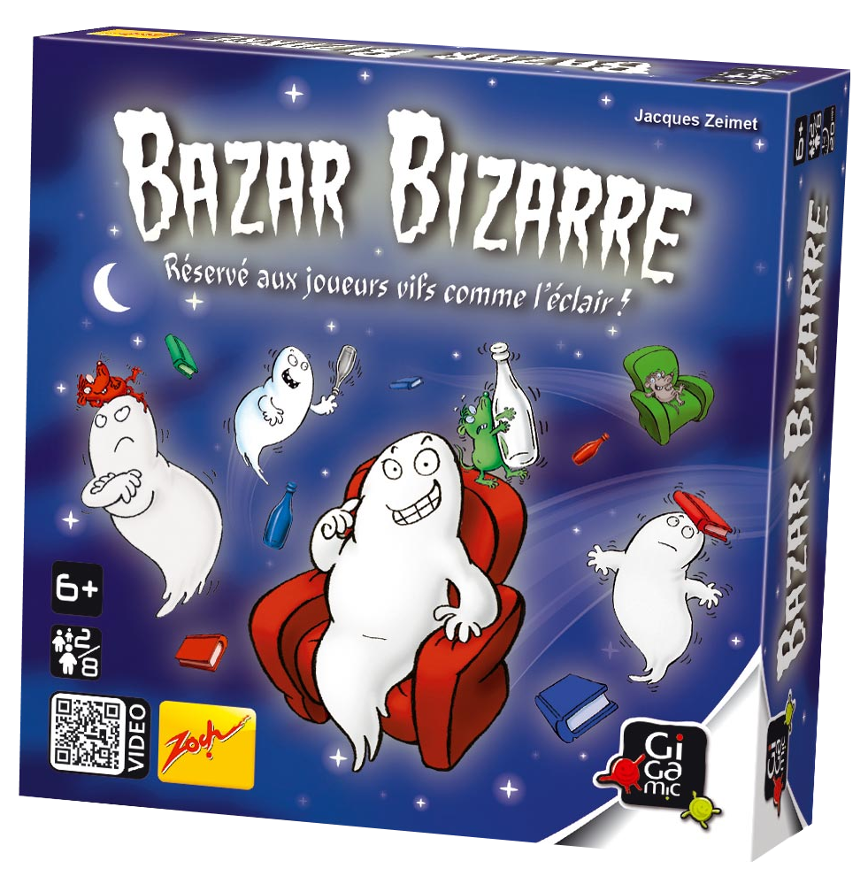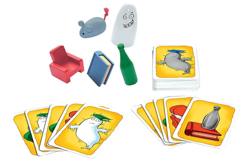 Principe et but du jeu : Franklin, le fantôme, a découvert un vieil appareil photo dans la cave du château. Il a immédiatement photographié tout ce qu’il aime faire disparaître… à commencer par lui-même. Malheureusement, les couleurs des clichés sont souvent mauvaises. Ainsi, la bouteille verte apparaît tantôt blanche, tantôt bleue. En regardant les photos, Franklin ne se rappelle plus exactement ce qu’il voulait faire disparaître…. Aidez-le à identifier rapidement la bonne pièce : les plus vifs ont les meilleures chances de mener la danse. Preparation : Disposer les 5 pions en cercle au milieu de la table. Mélanger les cartes et former une pile, faces cachées. Déroulement du jeu Variante 1: ATTRAPER LA PIECE Le dernier joueur à être descendu à la cave retourne la première carte de la pile, de manière à ce que tous la découvrent en même temps. Chacun tente alors d’identifier et d’attraper au plus vite la pièce représentée sur la carte si elle est de la même couleur, par exemple, le livre bleu ou le fauteuil rouge. Et si aucun pion représenté sur la carte n’est de la bonne couleur , il faut attraper la pièce qui n’a absolument rien en commun avec la carte : ni la couleur, ni l’objet. Exemple : Le joueur qui a attrapé la bonne pièce prend la carte en récompense et la pose face visible devant lui ; puis il retourne la carte suivante de la pile. Un joueur ne peut attraper qu’une seule pièce à la fois. Celui qui s’est trompé de pièce perd une de ses cartes (s’il en a déjà) : il la donne à celui qui a attrapé la bonne (si des adversaires se trompent, on peut donc gagner plusieurs cartes d’un coup). Variante 2: ATTRAPER OU CRIER Les modifications apportées à la règle de base sont les suivantes : Si la carte retournée représente un livre, il ne faut rien attraper mais crier le nom de l’objet recherché. S’il n’y a pas de livre, la règle est inchangée : il faut attraper la pièce recherchée. ATTENTION Chacun des joueurs n’a droit qu’à un seul essai. Ceux qui crient au lieu d’attraper une pièce ou qui attrapent une mauvaise pièce ou qui crient le nom d’une mauvaise pièce ou qui en attrapent une au lieu de crier ou qui crient et attrapent en même temps … … perdent chacun une des cartes déjà gagnées (s’ils en ont). Le joueur qui a attrapé ou nommé la bonne pièce reçoit cette (ou ces) carte(s). Mais si tout le monde s’est trompé, personne ne reçoit rien et chacun doit donner une carte ; dans ce cas, toutes les cartes, y compris la carte retournée, sont remises en dessous de la pile. Le joueur qui a attrapé ou nommé la bonne pièce retourne la carte suivante de la pile, toujours de manière à ce que tous puissent la voir en même temps ! Le fin de partie et le décompte des points sont inchangés.